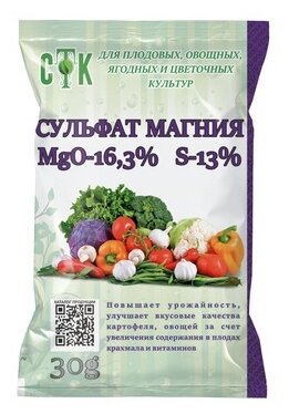 Сульфат магния (лат. Magnesium sulfate anhydrous) — это комплексный вид удобрения, который включает примерно 13% серы (SО3) и 17% магния (MgO), поэтому благоприятно влияет на урожайные качества многих растений.
