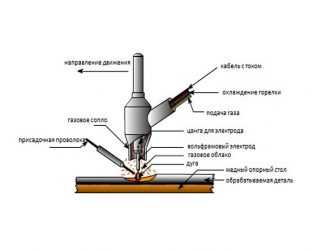 В процессе производства работ применяется специальный неплавящийся электрод, причем здесь допустимо пользоваться как прямой, так и обратной полярностью. Ключевым рабочим инструментом в данной ситуации будет горелка, в которой будет закрепляться электрод. Из ее сопла во время проведения работы будет выходить струя аргона.