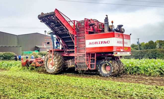 Для использования этого прицепного свеклоуборочного комбайна гидравлическая система трактора должна перекачивать не менее 114 л масла в минуту.