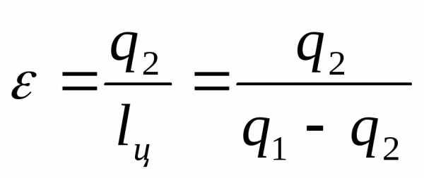 Отсюда следует, что ε увеличивается с повышением температуры в испарителе T2, (чем выше расположена линия 4-1, тем больше хладопроизводительность) и понижением температуры охлаждающе среды в конденсаторе T1 (линия 2’-2 расположена ниже, затрачиваемая работа в компрессоре меньше).