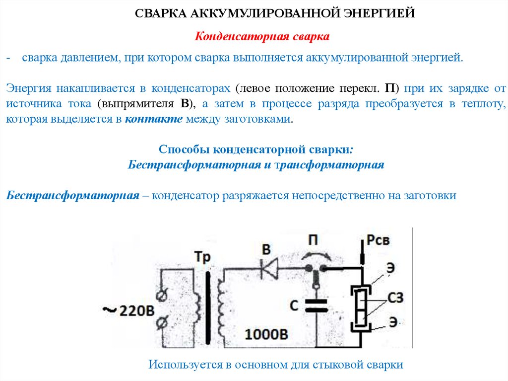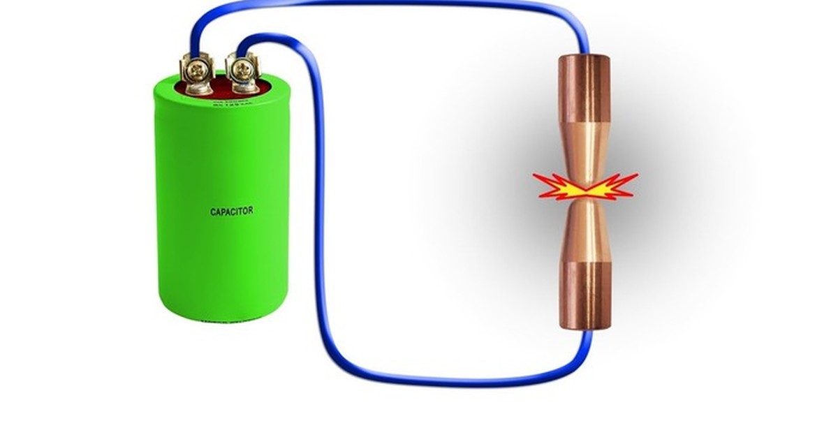 Моментальный разряд емкости мощных конденсаторов вызывает огромный скачок тока, процесс очень кратковременный, но токи могут доходить до десятков тысяч ампер в зависимости от емкости и напряжения конденсаторной батареи. Кратковременный разряд такой емкости приводит к моментальному плавлению металла под электродами.