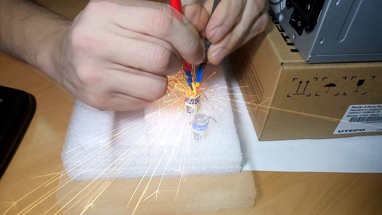 Нужны силовые кабели для передачи такого высокого тока. Провода 28 AWG, которые я спас от старого телефонного кабеля CAT3, даже едва выдерживают такой ток. По закону Ома, при 2,7 вольта, деленном на 3,2 мОм, мы можем ожидать до 843,75 ампер!