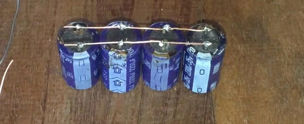 - берут 8 конденсаторов на 25 вольт, ёмкостью 15 000 микрофарад;