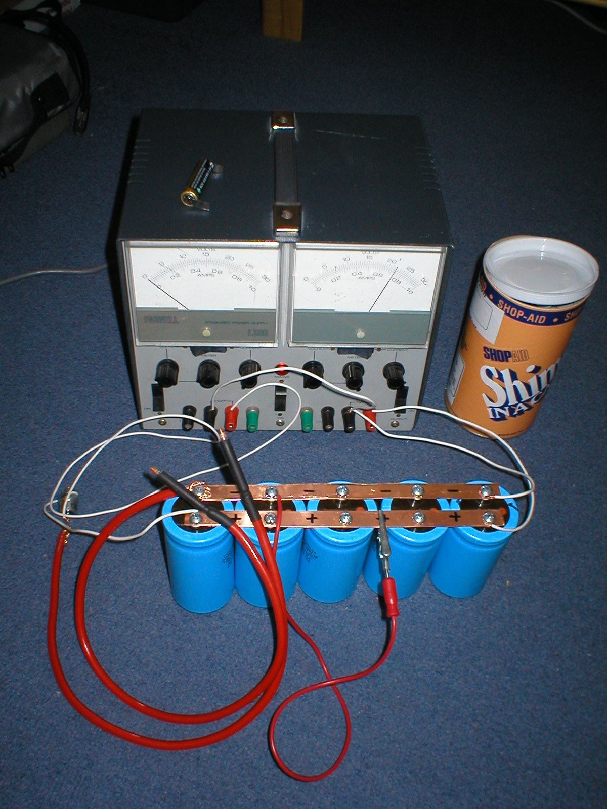 - один конец цепи соединяют с аккумулятором, который будет давать зарядку конденсаторной батарее;