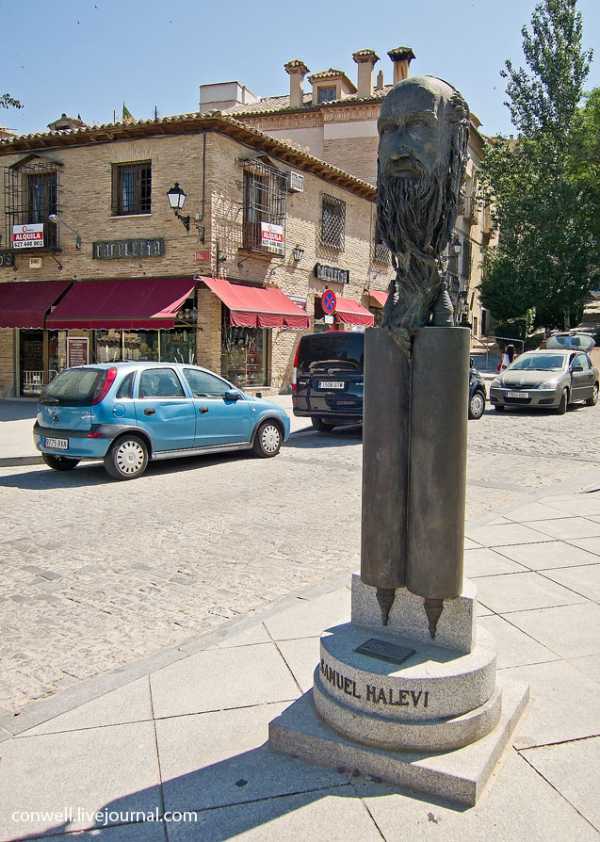 Спускаясь с «верхнего города» в еврейский квартал встречаешь необычный памятник – бородатая голова в ермолке, парящая над свитком Торы – это посвящение Самуэлю Халеви, министру финансов кастильского короля Дона Педро I, который настолько успешно вел дела, что на возникшие излишки смог построить самую большую синагогу в Толедо, но в результате королевского гнева лишился этой важной части организма…