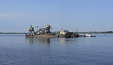 Многочерпаковый земснаряд с обслуживающими судами: на переднем планде грунтоотвозная шаланда, сзади — моторизированная завозня Земснаряд с грунтоотвозными шаландами в Невской губе, Санкт-Петербург