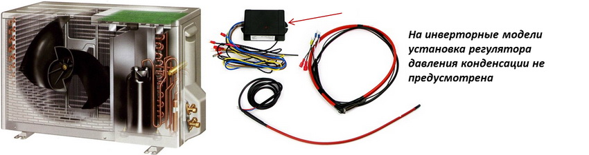 - Замедлитель скорости вращения вентилятора внешнего блока — микропроцессорный контроллер, замедляющий внешний вентилятор, чтобы предотвратить сильное переохлаждение и обмерзание конденсатора.
